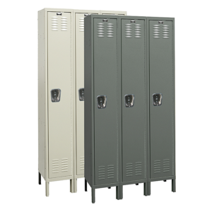 These high quality single tier lockers have louvered 16 gauge steel doors with a stainless steel recessed handle and fingertip lift lever that operates the secure latching mechanism. The smooth front profile of the recessed handle prevents catching and banging. The handle also includes an integral padlock hasp that shelters lock shackle to discourage tampering. Includes a hat shelf and coat hooks. Painted inside and out with powder coat finish. Legs add 6″ to height. Each door includes a number plate.
